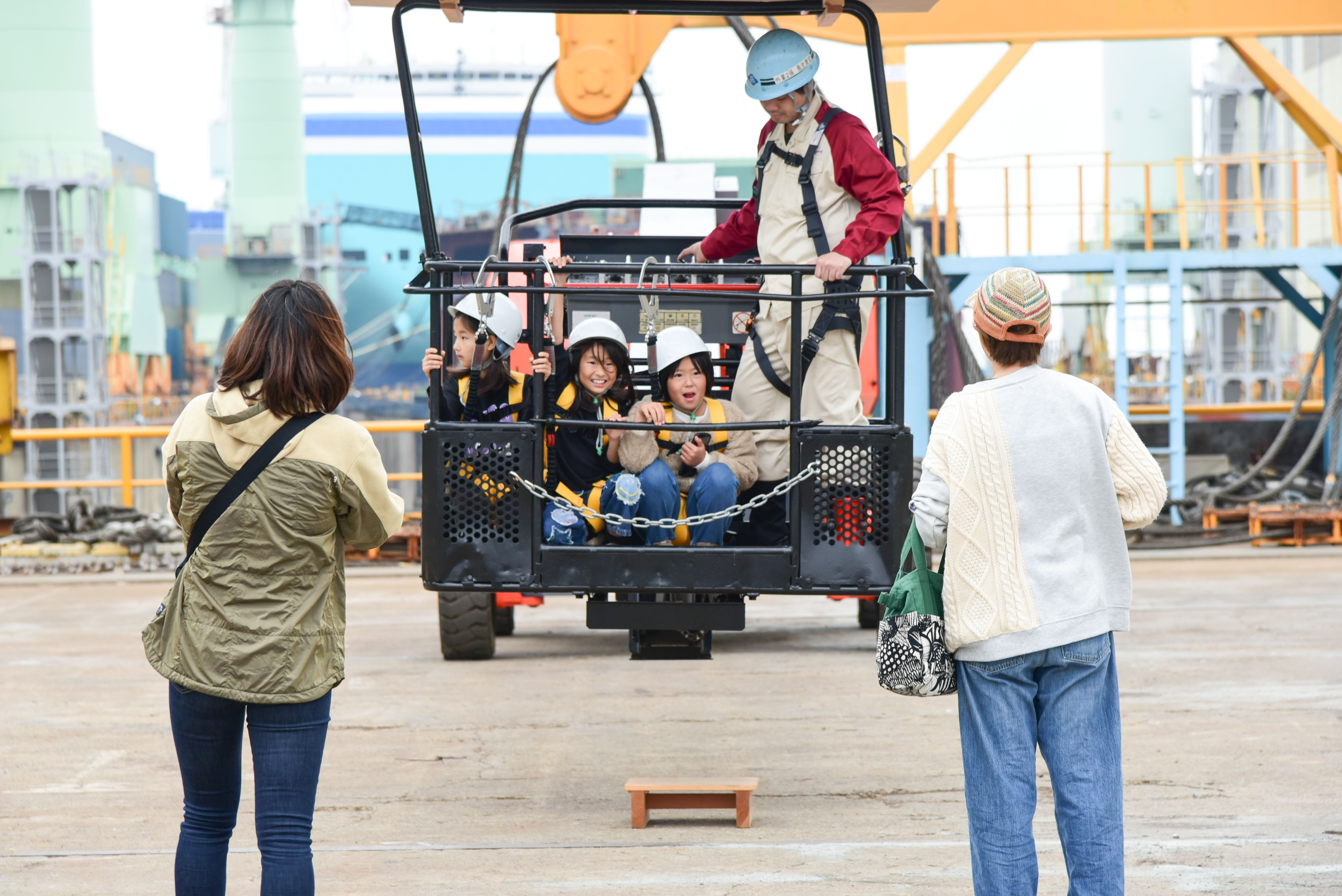 前日まで雨天予報もある中、雨対策の準備に追われるスタッフ一同。ヨシ、これでどんな天候になろうとも開催し、来場者に喜んでもらえるだろうと迎えた当日朝、雨の気配は無し。今年は、8年ぶりの自動車運搬船(主燃料LNG 7000台)の船内見学に加えて、行列必至の高所作業車体験は6台構えました。地元の郷土芸能やダンス、ライブ披露から新企画!マグロの解体ショー、名物の恒例イベント餅まき、豪華景品が並ぶ福引抽選会とたくさんイベントを詰め込んだ成果もあり、過去最多の5,700名の方にご来場いただけました。みなさま、天候不安の中、足を運んでいただきありがとうございました。