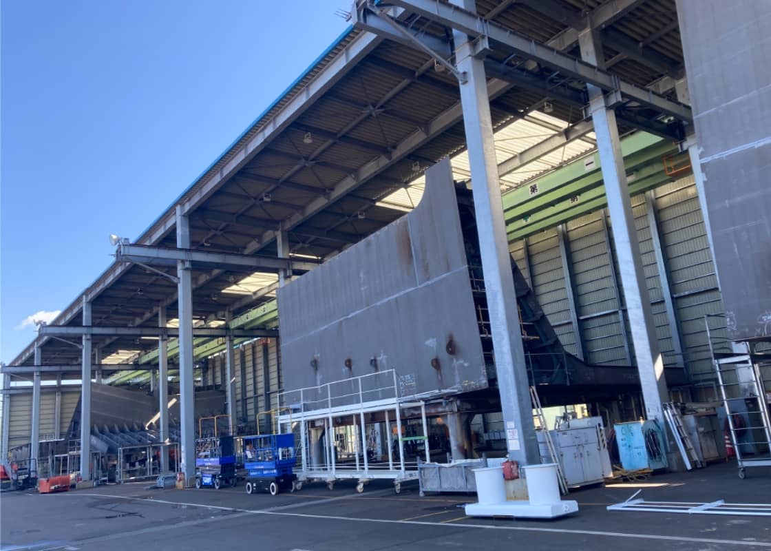 地上で総組立を行ったブロックは、ドック内へ搭載されていき、段々と船のカタチになっていきます。